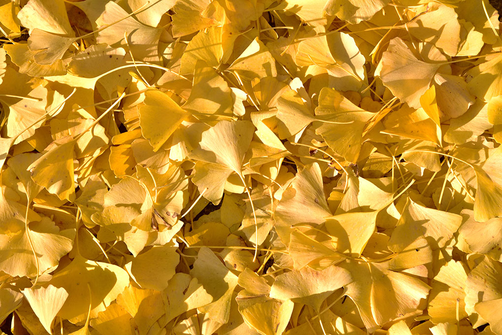 大きな銀杏の木があり、葉っぱが半分ぐらい残っている。